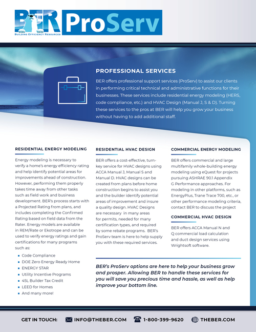 BER offers professional support services to assist our clients in running the professional services of their businesses. These services include residential energy modeling, residential HVAC design, commercial energy modeling and commercial HVAC design. BER uses a variety of software options to meet our clients’ unique needs, primarily REM/Rate, Ekotrope, Wrightsoft and eQuest. Additional options are available if needed.